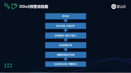 基于傳統肉雞養殖場的僵尸網絡檢測方法主要利用各類蜜罐、入侵檢測系統、Netflow異常流量檢測等安全分析系統。在談到金山云DDoS預警與其他方式的不同之處時,馬西興表示:“我們實驗室研究員通過對肉雞樣本進行深入逆向分析,按照其和C&C端的交互協議,對BOT端進行代碼重構,能夠做到在C&C端發出攻擊指令的同時,對目標站點進行攻擊預警,同時在系統資源占用、反沙箱、漏洞利用監測等方面達到了較好的效果,從而實現不戰而屈人之兵,將DDoS攻擊扼殺在萌芽狀態。”