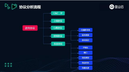 “這是安珀實驗室在DDoS防御上的一個比較典型的案例,相比于被動的高防清洗,主動出擊尋找攻擊源頭,顯然是更高效的防御手段,”馬西興表示,“金山云通過逆向協議分析流程,獲取C&C域名或IP地址、主機上線協議、心跳協議、攻擊協議、控制協議等關鍵樣本信息,來輔助預警工作。”具體而言,一方面讓樣本在沙盒中跑起來,觀察它在運行過程中的流量交互信息;另一方面通過對其進行反匯編,遇到加密的指令時,對加密指令進行解密操作,從而獲取更多有效信息。