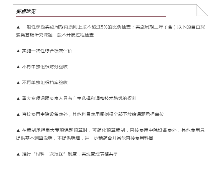 重點核心任務攻關課題堅持定期檢查;一般性課題實施周期內原則上按不超過5%的比例抽查;實施周期三年(含)以下的自由探索類基礎研究課題一般不開展過程檢查。相對集中時間開展聯合檢查,避免在同一年度對同一課題重復檢查、多頭檢查。