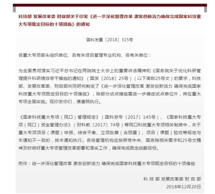 為全面貫徹習近平總書記關于科技創新的重要論述,落實黨中央、國務院關于推進科技領域“放管服”改革和《國務院關于優化科研管理提升科研績效若干措施的通知》(國發〔2018〕25號)(以下簡稱25號文)的要求,充分激發科研人員創新活力,加快國家科技重大專項(以下簡稱“專項”)組織實施,突破核心領域關鍵技術,保障專項總體目標圓滿完成,為國家經濟社會高質量發展提供科技支撐,科技部、發展改革委、財政部(以下簡稱“三部門”)按照明確責任、規范流程、講求績效、綜合激勵的原則,制定以下措施。
