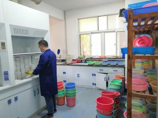 ▲南京地質古生物研究所的現(xiàn)代古生物學與地層學國家重點實驗室的實驗人員正在進行微化石的預處理,這些“菜筐”里都是化石。