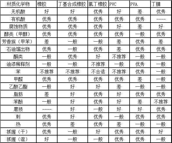 表1和表2列出了各種材質手套的優缺點以及防化性能,可以作為選擇手套的參考。