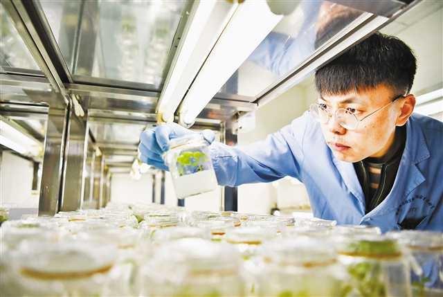 5月6日,西南大學桑樹組織培養(yǎng)室,科研人員正在觀察培養(yǎng)基中的桑樹樣本。