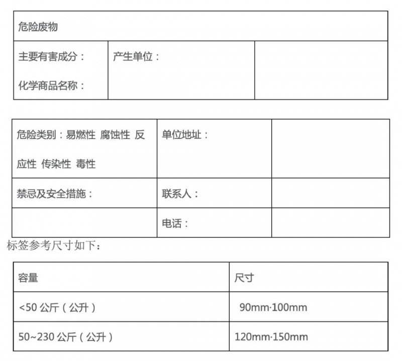 (1) 為運輸方便,包裝容器的容量一般不應超過230升。儲罐、儲槽等固定式危險廢物儲存容器的容量可不受此限制,但此類儲存容器在使用前應征得環保部門的批準。