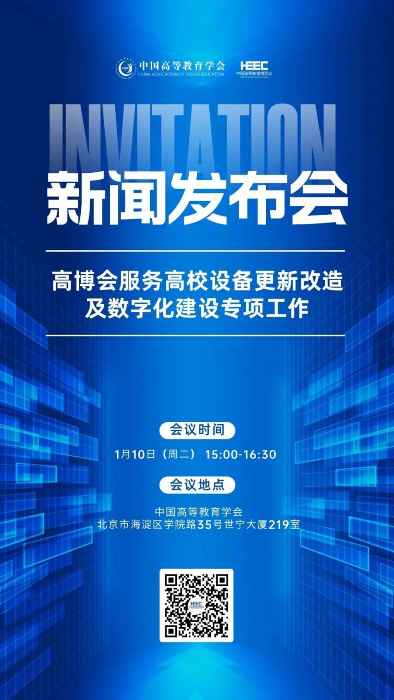 作為政企校溝通的橋梁和紐帶,中國高等教育博覽會(以下簡稱高博會)30年來始終堅持與時俱進、砥礪前行,聚力服務國家經濟社會發展和高等教育改革。為貫徹落實黨的二十大精神,服務高等教育數字化轉型發展,推進我國高等教育領域設備升級改造,提升高等教育教學科研高水平成果產出,中國高等教育學會(以下簡稱學會)把服務高校設備更新改造及數字化建設列為重點工作,并列入高博會的重要職能范圍。為此,學會將于2023年1月10日(周二) 15:00-16:30在北京召開“高博會服務高校設備更新改造及數字化建設專項工作”新聞發布會,直播地址請識別下方圖片二維碼。